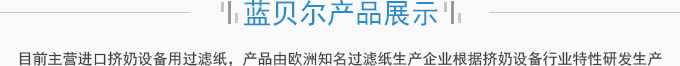 濟(jì)南藍(lán)貝爾工貿(mào)有限公司主要產(chǎn)品擠奶設(shè)備過(guò)濾紙,牛奶過(guò)濾紙,擠奶機(jī)過(guò)濾袋,目前主營(yíng)進(jìn)口擠奶設(shè)備用過(guò)濾紙,產(chǎn)品由歐洲知名過(guò)濾紙生產(chǎn)企業(yè)根據(jù)擠奶設(shè)備行業(yè)特性研發(fā)生產(chǎn),產(chǎn)品符合歐盟食品接觸標(biāo)準(zhǔn)及FDA食品接觸標(biāo)準(zhǔn),產(chǎn)品在擠奶設(shè)備過(guò)濾紙行業(yè)占有70%以上的份額。并通過(guò)了SGS標(biāo)準(zhǔn)技術(shù)檢測(cè)中心按國(guó)標(biāo)食品級(jí)標(biāo)準(zhǔn)進(jìn)行的檢測(cè)。產(chǎn)品適用于各種擠奶設(shè)備品牌,本公司目前獲得該區(qū)域產(chǎn)品營(yíng)銷資格。產(chǎn)品已用于國(guó)內(nèi)各大乳企所屬...
